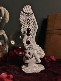 made with jewellery silver eye pins and jump rings, 8mm red glass beads and a “bloody” DND dice charm